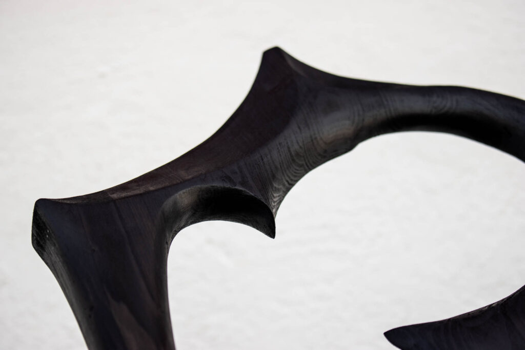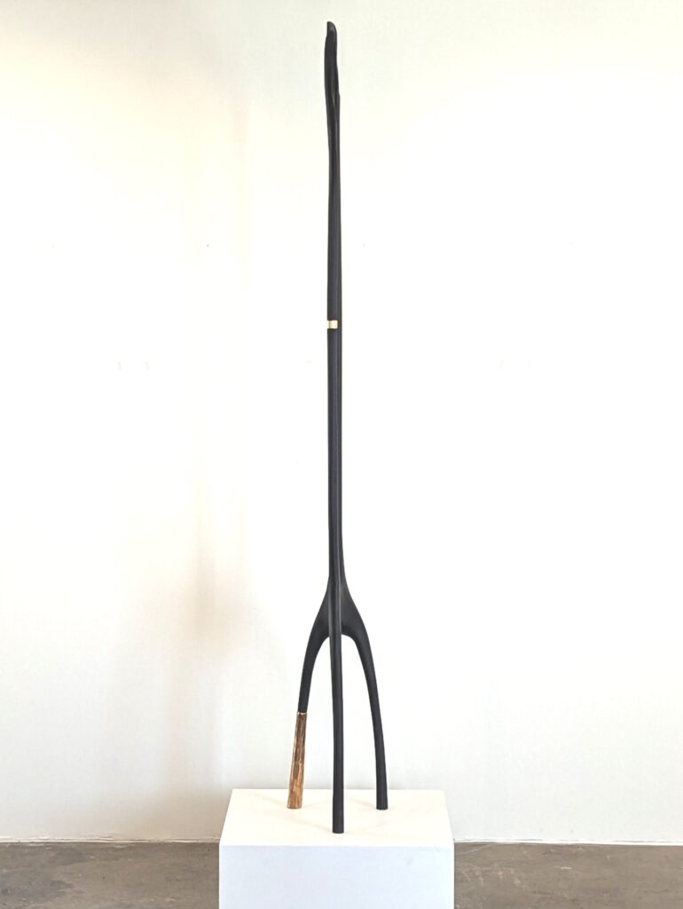 Fir wood, black linseed oil paint, ceramics, 22k gold, 211 cm high.